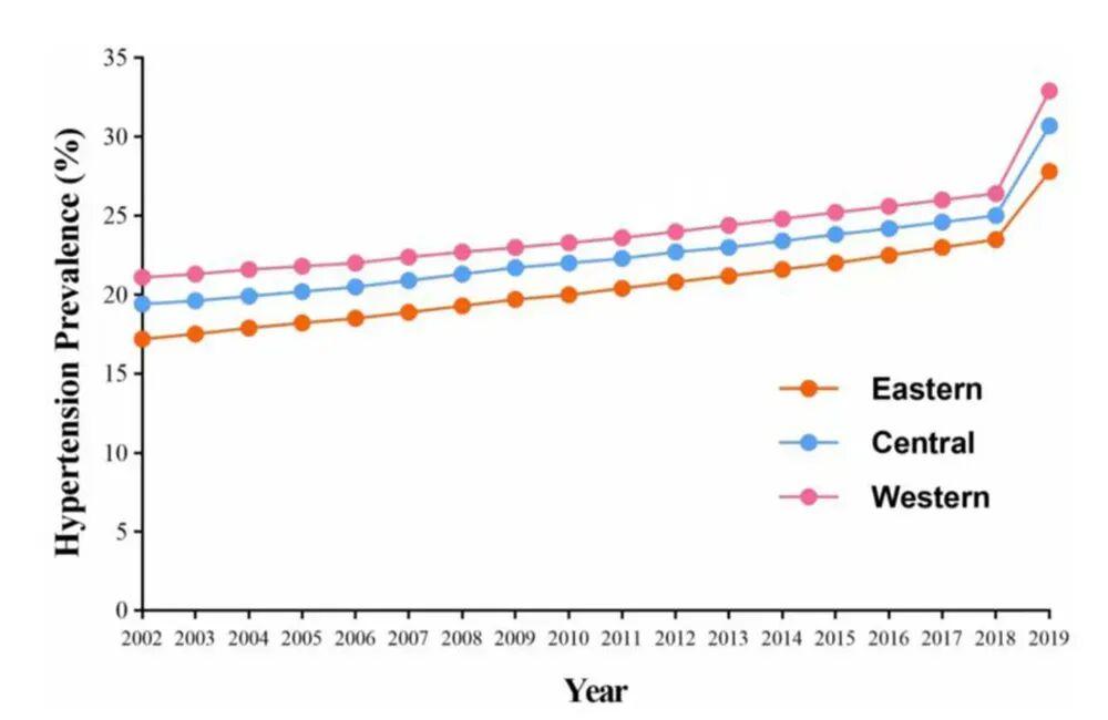 从地理分布来看,我国西部地区的高血压患病率最高,2019 年达到 32.9%,而东部和中部相对较低[1]。同时,北方整体水平高于南方,这与饮食习惯有直接关系——北方居民普遍偏好咸食,盐摄入量长期高于南方。