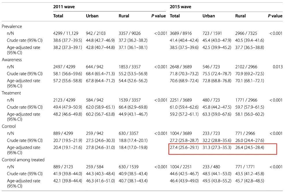 参考资料[1]:各地区高血压患病率城乡之间的差距同样明显。虽然 2011–2015 年间,农村居民的高血压知晓率和治疗率有所提升,但控制率仍落后于城市:2015 年,城市高血压患者的控制率约为 31%,而农村约为 26%[3]。