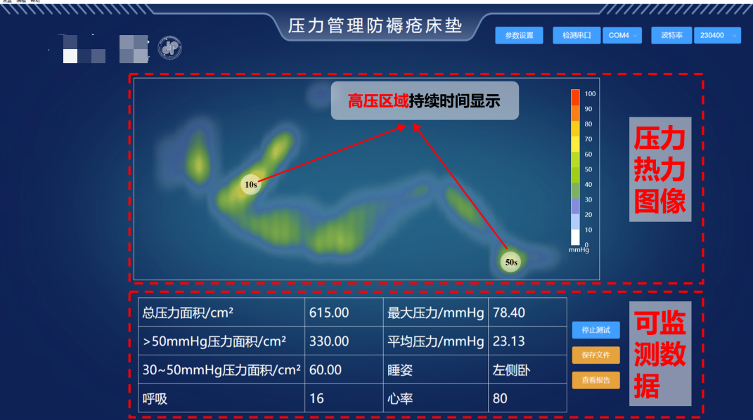 配套的数据采集及压力可视化系统作用关键。系统下位机采集软件采用模块化编程,上电后自动初始化各端口并等待压力采集,通过采集床垫电阻值变化并转换成计算机可识别的电信号,实现压力数据可视化显示。该系统能实时分析总压力面积、最大压力、平均压力、睡姿、高压区域持续时间、呼吸和心率等多项睡眠数据。