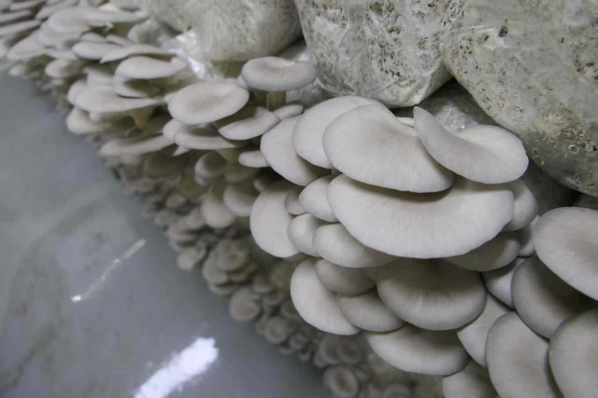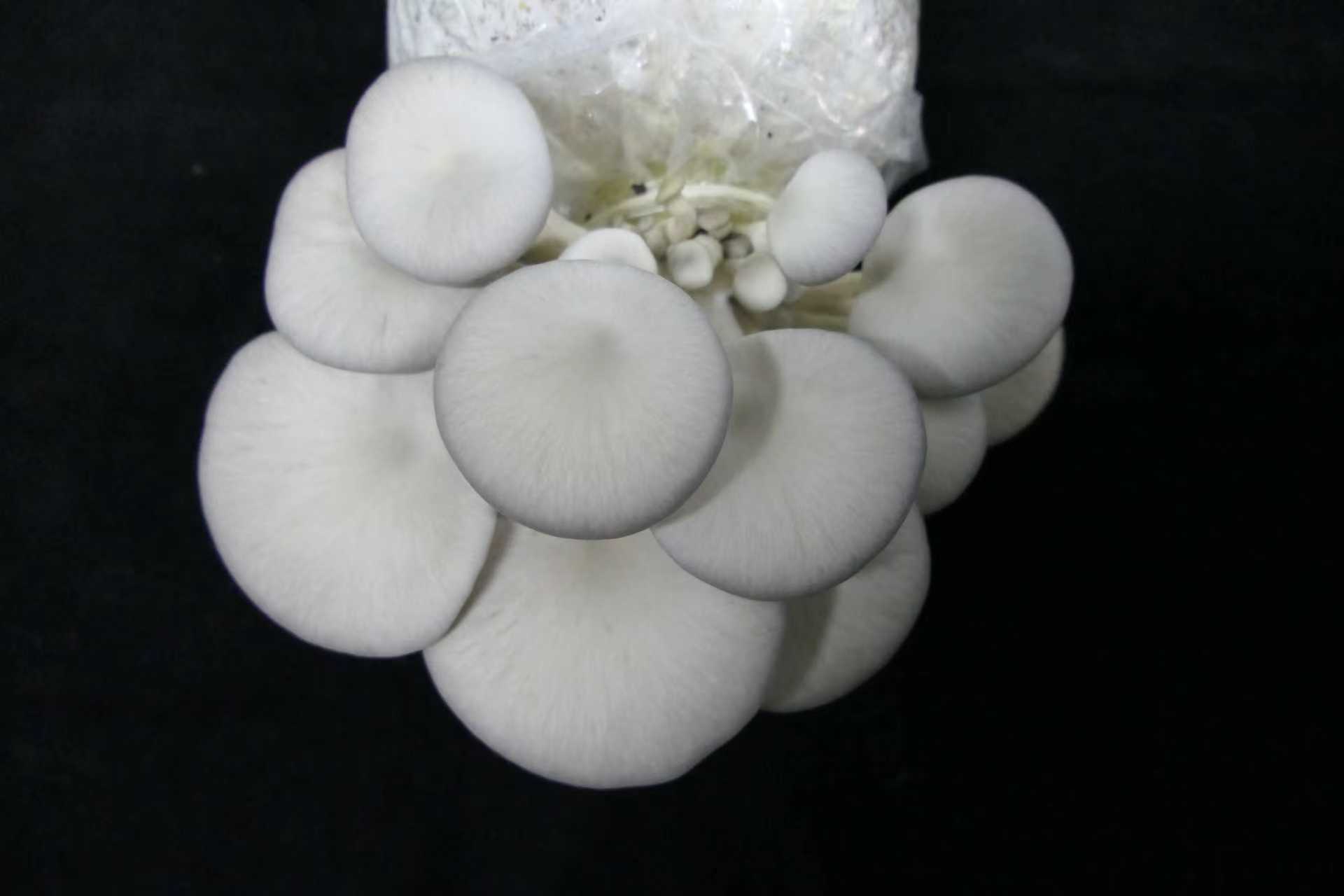 平菇菌盖下方有类似鱼鳃的褶状结构,即菌褶,孢子就生长在菌褶上。平菇的孢子类似于植物的“种子”,孢子萌发就形成菌丝,菌丝再扭结就形成市面上我们看见的蘑菇了。如果在平菇下方放置一张深色纸,出菇后可以看到纸上落有白色粉尘状物质,那就是无数平菇孢子堆积形成的。