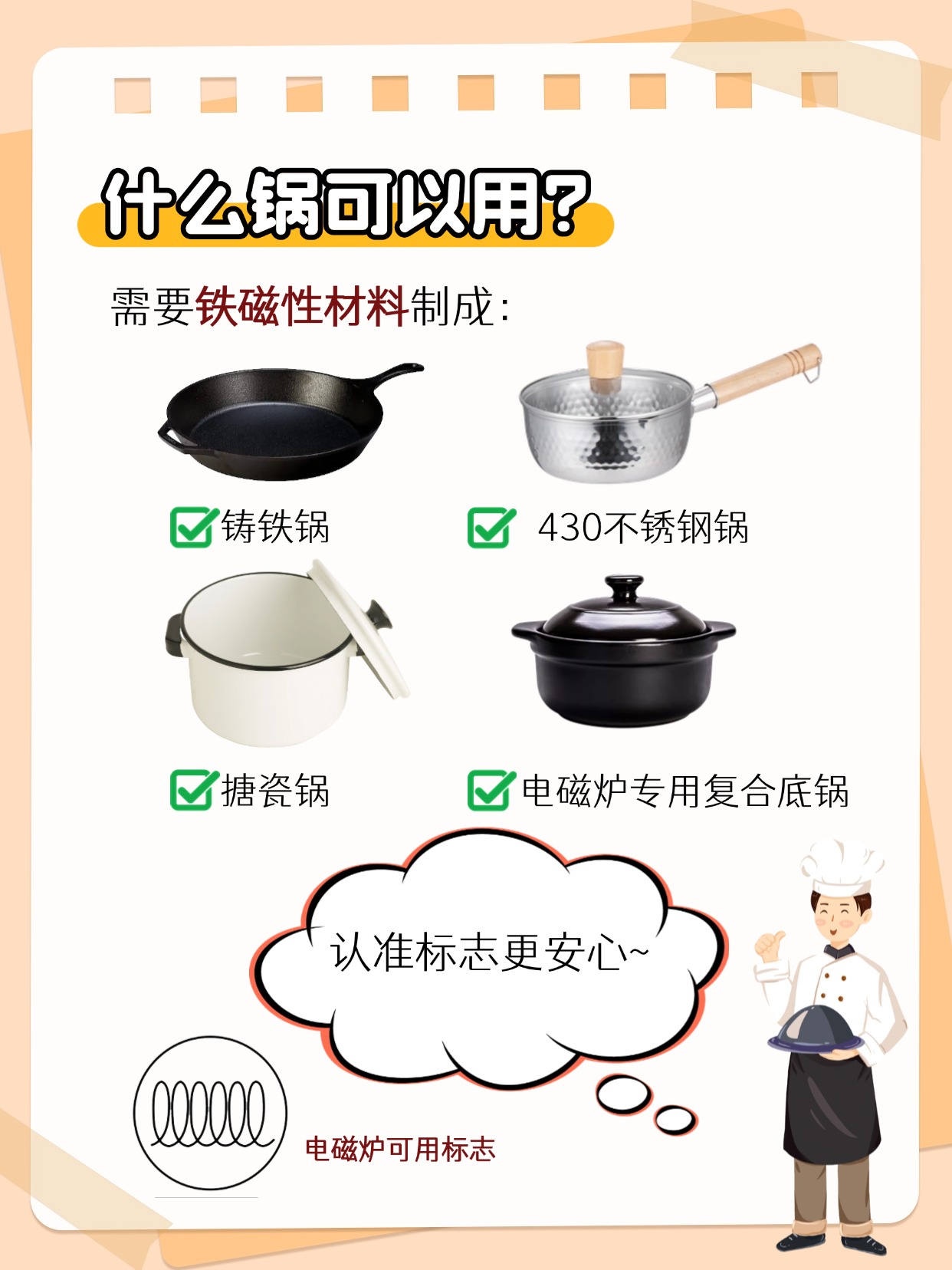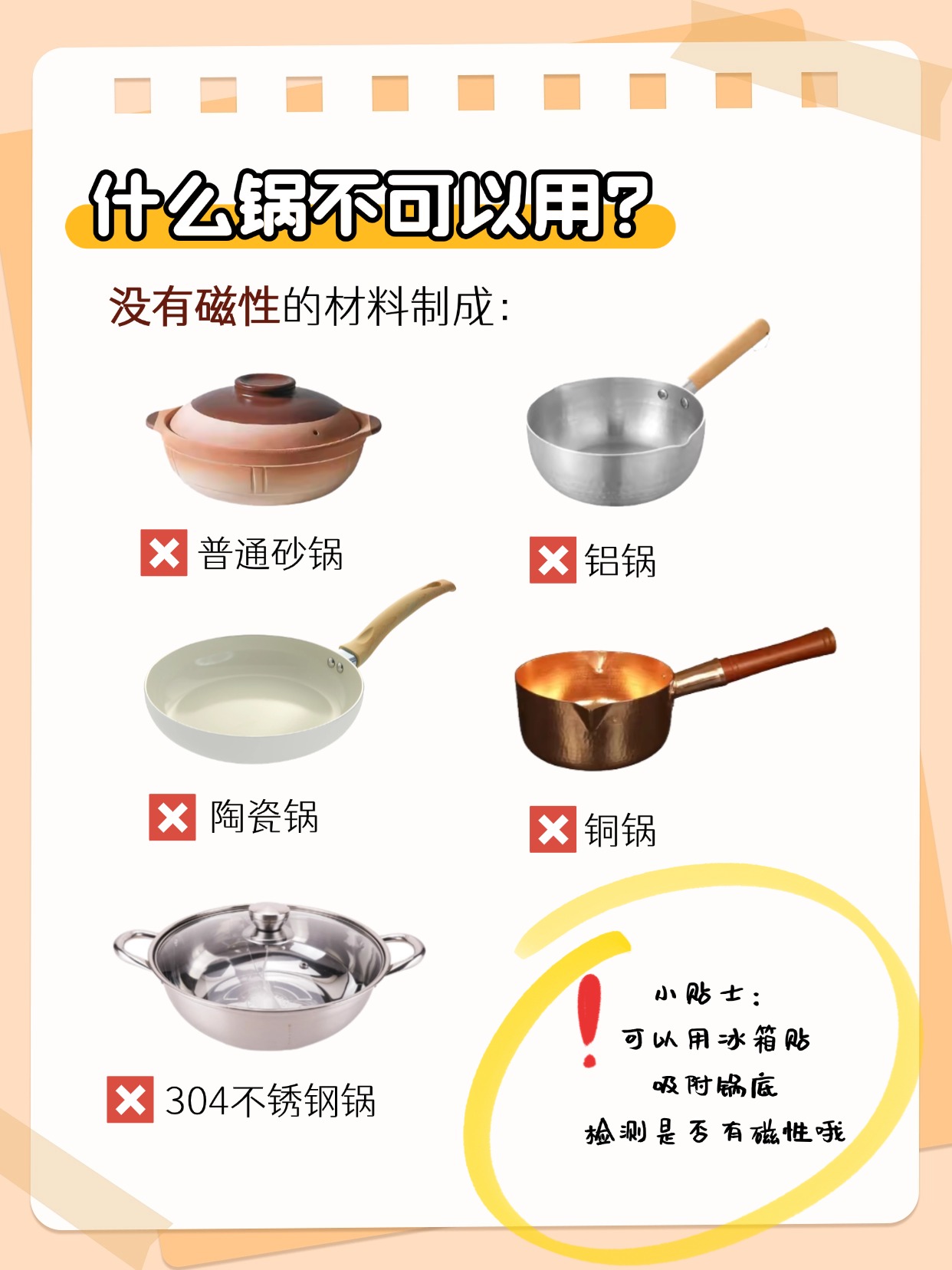 买锅的时候要注意有没有标注“电磁炉适用”的螺旋线圈标识。也可以拿冰箱贴试一试能不能吸在锅底,可以吸住就能放心使用啦!