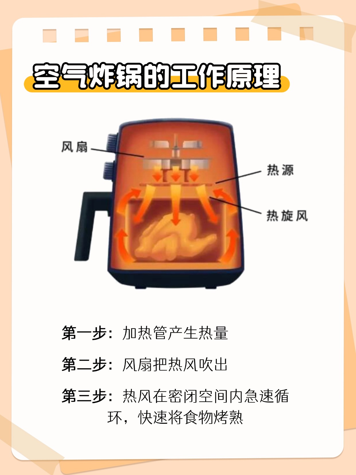 •空气炸锅:高速热风循环🔥💨——顶部的加热管产生热量,风扇把热风吹出,在密闭的小空间内急速循环,快速将食物烤熟。这种方式能够模拟油炸的效果,使食物外表酥脆。
