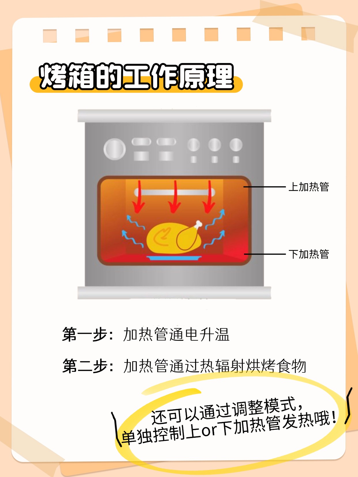 •烤箱:电热元件辐射☀——它通常在顶部和底部都设有加热管,通过热辐射来烤熟食物。这种加热方式更注重均匀受热,能够锁住食材的水分,使食物口感更加香嫩多汁。