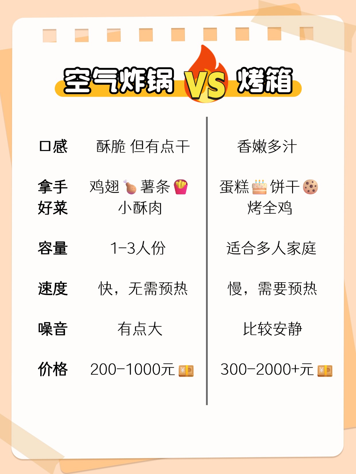 •擅长食物:空气炸锅适合鸡翅、薯条、五花肉等本身含油脂的食物;烤箱功能更丰富,适合制作蛋糕、面包、披萨、饼干等需要精准控温的烘焙美食。