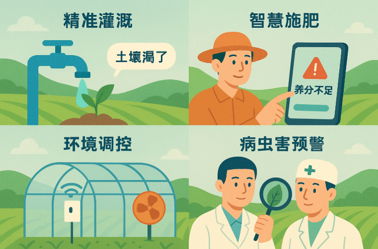 精准灌溉:土壤“渴了”,系统自动提醒,甚至能远程控制喷灌,做到“按需供水”。