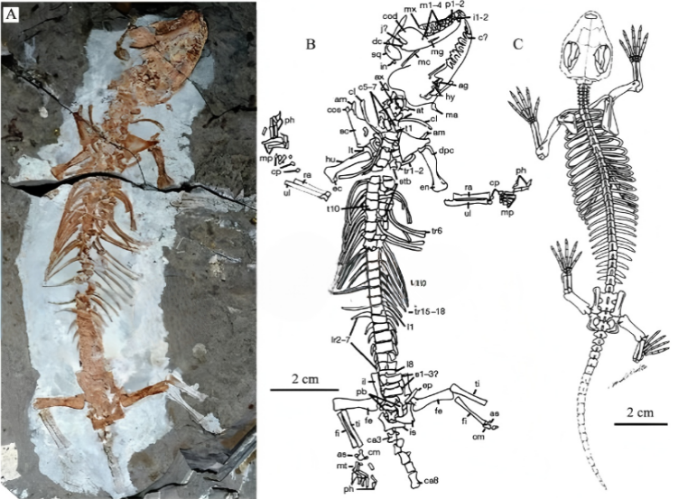 阿氏燕尖齿兽 Yanoconodon allini骨架(NJU-P06001A,正模)A.标本照片,B.骨骼结构,C.复原图(引自 Luo et al,2007a)
