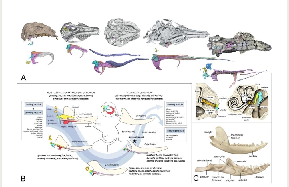 古生物学家一直好奇:爬行动物的“下巴骨头”,是怎么慢慢变成哺乳动物的“听小骨”的?阿氏燕兽的耳朵,正好给出了答案—它的耳朵处于“完美过渡阶段”: