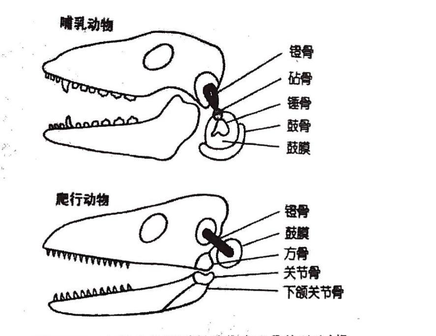 爬行动物和哺乳动物中耳骨的对比(据Savage and Long,1986)