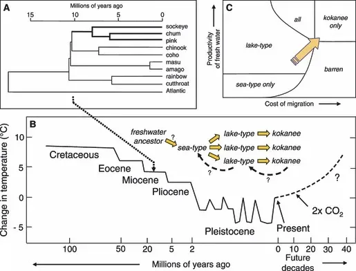从第四纪冰期开始到今天的漫长过程,这些鲑鱼祖先遭遇冰冷洪水,先死掉了绝大多数。随后部分进入海水,剩下的部分又死掉了绝大多数。最终,一部分体液渗透压稍高的个体,扛过一段时间后,再次回到了淡水,从而得以繁衍生息。(由于祖先可能已经发生过“淡水⇄海洋”适应过程,它们再次适应海洋环境也更加的容易。)