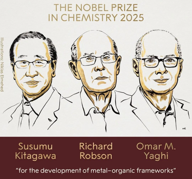 欧洲中部时间10月8日11:45,瑞典皇家科学院宣布,将2025年诺贝尔化学奖授予北川进(Susumu Kitagawa)、理查德·罗布森(Richard Robson)和奥马尔·M·亚吉(Omar M. Yaghi),以表彰他们“开发了金属有机框架(MOF)”。