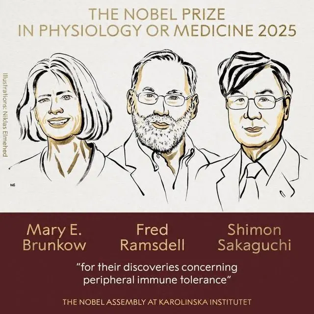10月6日,瑞典卡罗琳医学院宣布,将2025年诺贝尔生理学或医学奖授予美国科学家玛丽·E·布伦科(Mary E. Brunkow)、弗雷德·拉姆斯德尔(Fred Ramsdell) 日本科学家坂口志文(Shimon Sakaguchi),以表彰他们在发现调节性T 细胞(Treg 细胞)及其外周免疫耐受机制方面的突破性贡献。