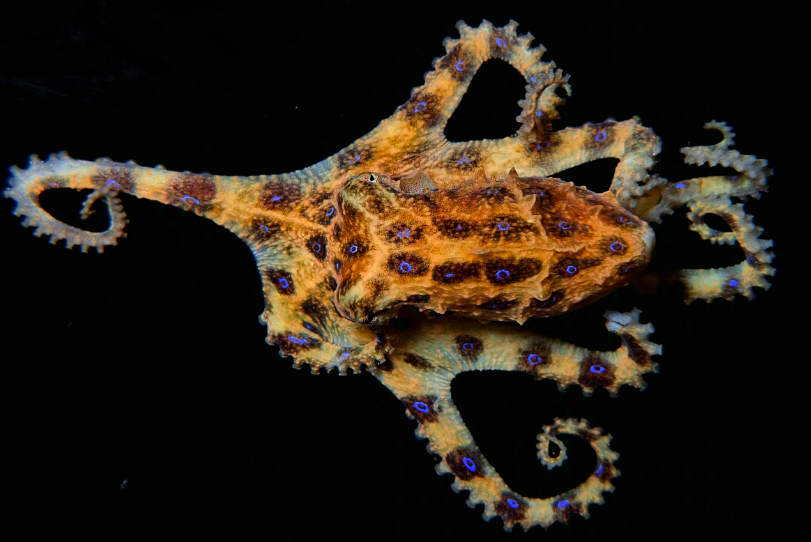 蓝环章鱼体型只有高尔夫球大小,体表为黄褐色。它最显著的特征是身体上分布着鲜艳的蓝色环纹,这些环纹在遇到危险时会发出耀眼的蓝光,起到警告作用。蓝环章鱼体内含有一种名为河豚毒素的神经毒素,这种毒素对中枢神经和神经末梢有极强的麻痹作用。河豚毒素能够阻断肌肉的钠通道,导致肌肉瘫痪和呼吸停止。