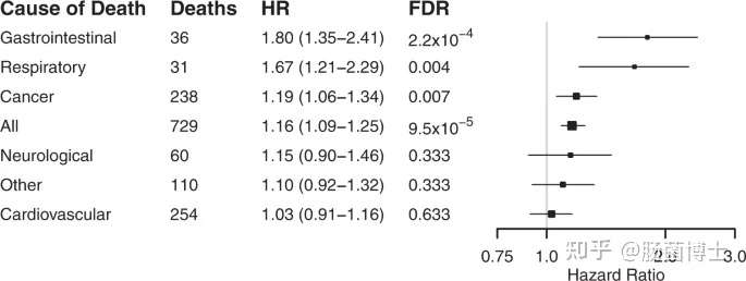 研究人员在针对特定疾病与死亡风险进行主成分分析后,发现肠杆菌科的细菌丰富度和肠道微生物的一个主成分PC3的增加与胃肠道疾病、呼吸道疾病导致的致死率有着紧密的联系,同时,肠杆菌科总丰度与肝脏疾病也有相关性。