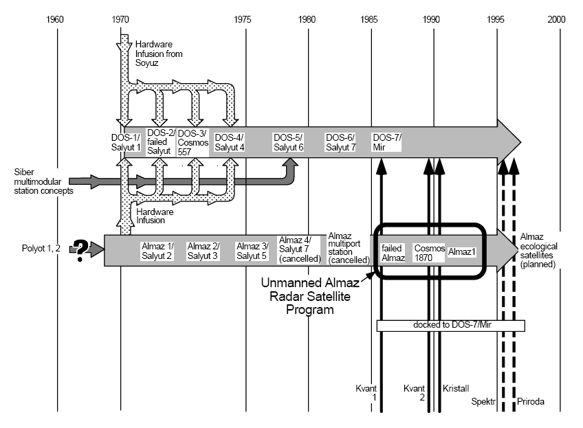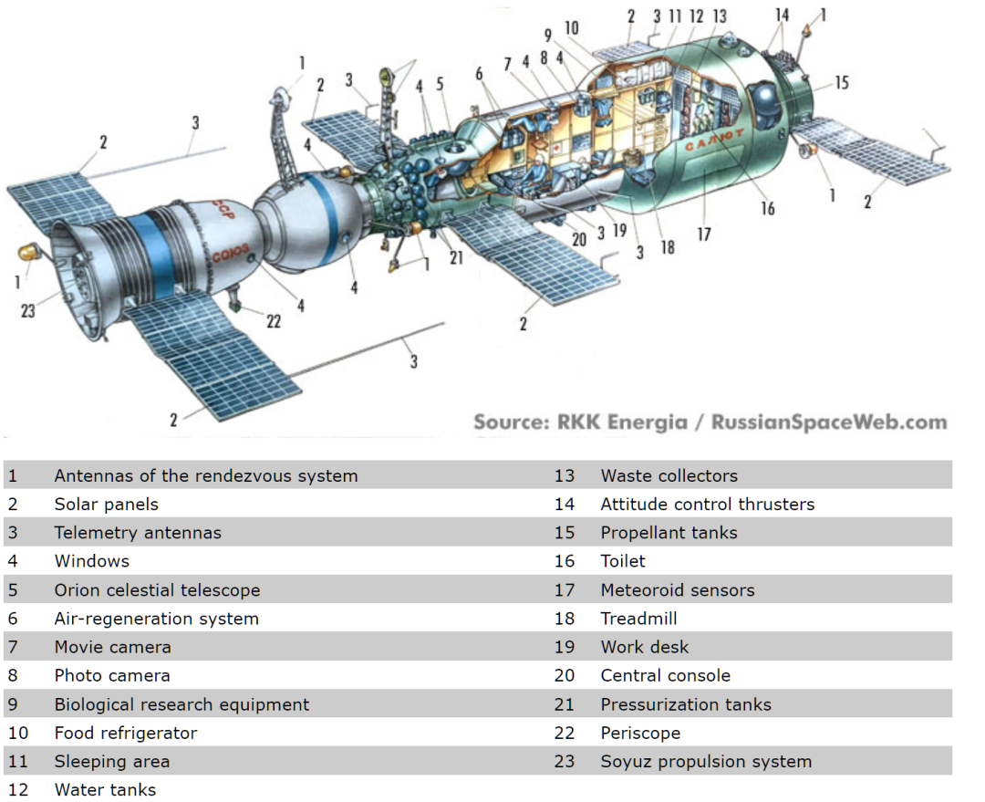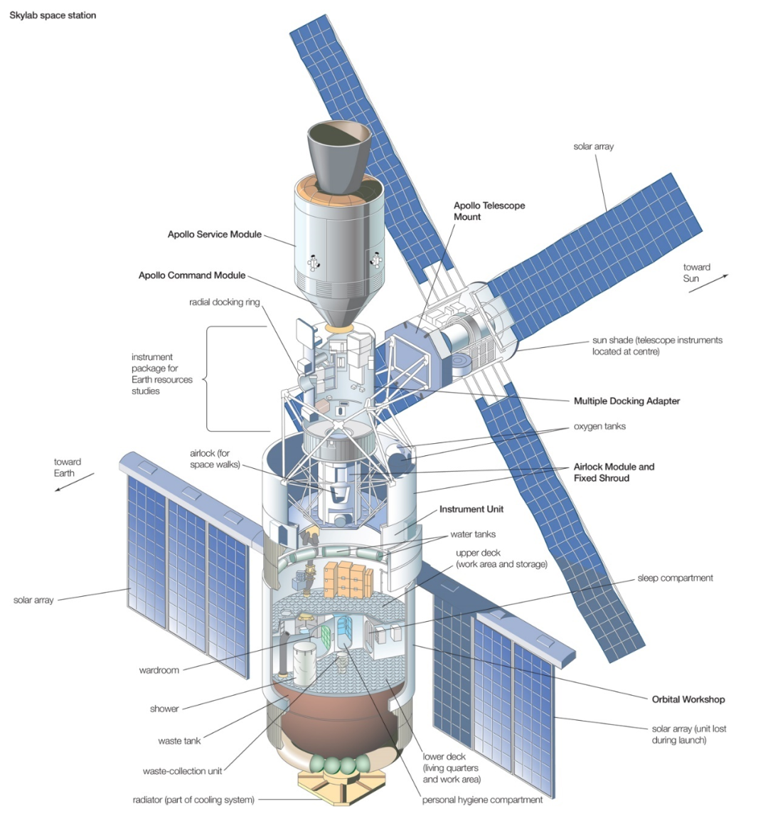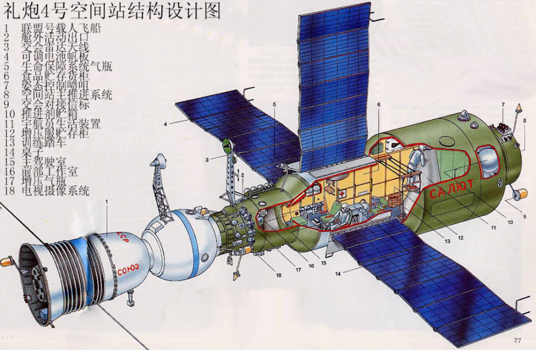 神舟十二号的成功发射又一次把“空间站”这个概念重新推向公共视野。也许读者们都已经对“空间站”这个概念并不陌生,在无数的影视作品中多多少少都有所了解,那么何不来一次更详细的了解呢,快来跟着我来梳理一下“空间站”的发展历程! 1869年Edward Everett Hale在他的小说《The Brick Moon》中首次提到了一个用砖建成的漂浮在地球轨道上的“月球”。但Hale提到的仅仅是一个“在轨的板砖”而已,虽然可供人类居住,但与我们今日见到的甚至最早提出的空间站概念都大相径庭。现代空间站的雏形最早在1895年出版的《Dreams of the Earth and Sky(地球与天空之梦)》中提到——这是一个可以居住20名人类的空间站和火箭复合物。 作者认为可以通过空间站的自转产生离心力用以模拟重力,甚至可以通过携带温室来达到“自给自足”的目的。此后冯·布劳恩的导师Hermann Oberthg著作《太空旅行之路》中对空间站的建设以及太空旅行做了论证。值得一提的是Oberthg本人曾提到“the Sun Gun”这一概念——通过发射一个直径超过八千公里的反射镜将太阳光聚焦在某一个城市上使其燃烧,这一异想天开的想法最终成为了007系列电影《Die Another Day》中的Icarus,当然这是题外话。 007系列电影《Die Another Day》中出现的Icarus 1929年奥地利人Herman Potočnik出版了《The problem of space travel(太空旅行问题)》,这本书从各个角度对空间站的可行性做了基础的论证:从空间站的发射到星际旅行,乃至太空殖民。此后的土星五号之父冯·布劳恩在《Collier's Weekly》上发表了一篇关于环状空间站的设计概念,也许是受到了Potočnik的启发,这样的空间站设计让周围绕其中心旋转,用离心力在太空中模拟重力。1955年12月,冯·布劳恩在迪士尼的电视节目《人与月球》中又一次提出了利用旋轮空间站作为一个登月的中继站,让人类迈出那个“一大步”。 Herman Potočnik提出的空间站构想 1957年8月21日苏联发射了历史上的第一枚洲际导弹,10月4日又成功发射了人类的第一颗人造卫星(Sputnik1),1961年4月12日,尤里加加林代表人类进入太空。为了在太空竞赛中快速追平与苏联之间的差距,1962年9月12日美国时任总统的约翰·肯尼迪在赖斯大学发表演讲《We Choose to Go to the Moon》揭开了登月竞赛的帷幕。 Sputnik-1 时间来到1964年10月12日,切洛梅设计局(OKB-52)设计局的Vladimir Chelomei(弗拉基米尔·切洛梅)提出了Almaz(阿尔玛兹)作为对美国MOL(载人轨道实验室)项目的回应,此时人类第一个真正实施的空间站计划诞生。1969年7月20日,人类的脚印留在了月球上,苏联在这场登月竞赛中落败,为此苏联筹划建造并发射人类史上的第一座空间站。 为了方便后续的阅读,这里简要介绍一下Salyut。Salyut以Almaz为参照,分为OPS(Orbital Piloted Station)轨道试验站和DOS(Durable Orbital Station)。Almaz(OPS)认军方为甲方爸爸,而后者(DOS)则为民用, 为降低军事色彩后将二者统一归入Salyut计划。因为都由质子号携带发射,受到整流罩大小以及运载能力限制,因而空间站在早期就深得“科技以换皮为本”的真传。虽然各空间站的数据相差并不大,但依然存在细微区别,例如携带的实验设备、外形设计等。 Salyut一代空间站大致一览 苏联空间站的发展史 1971年4月原定于12号发射的礼炮一号Salyut1因测试发生问题,发射日期被推至19号。4月19号莫斯科时间4:40,一枚三级UR-500K火箭发射升空,40秒后便消失在厚厚的晨雾中,随后人类的首个空间站Salyut1(DOS-1礼炮一号)成功入轨。 礼炮一号携带了总质量1.5吨的科学仪器,包括OST-1太阳观测望远镜,RT-4X射线探测仪,ITSK红外光谱仪以及一个拥有60X放大倍率的OD-4望远镜。 1971年4月23日,联盟十号成功发射(Soyuz 10),原定于4月24 日的对接计划,因对接舱口出现故障只得作罢。1971年6月27日,联盟11号的宇航员成功与DOS-1对接,并且在太空中生活了23天,完成预定的任务后开始返回地面。遗憾的是途中返回舱发生的减压事故让这三位宇航员再也无法见到胜利的鲜花了。这三位宇航员分别是航天指令长Georgy Dobrovolsky,试验工程师Vladislav Volkov和飞行工程师Viktor Patsayev。 礼炮一号的结构 1973年4月3日,礼炮二号Salyut2(OPS-1)发射升空,虽然顺利进入轨道,但是意外还是出现了。仅仅入轨三天后,携带OPS-1的质子号三级火箭因为燃料箱压力发生变化,在轨道发生了爆炸,产生的碎片于十天后击中了 OPS-1的舱体和光伏面板,导致舱内压力骤减,失去了电力供应,最终于1973年5月28日落入太平洋。 Salyut-2 让我们将目光转向地球的另一边。1973年5月14,土星五号完成了它生涯中最后一次任务——将重达80吨的Skylab1主体一次性送入轨道。这次发射是土星五号为数不多的失败之一,待会我们会聊到这个问题。 土星五号火箭发射 首先这个空间站非常“大”!Skylab由轨道舱、过渡舱、多用途对接舱、太阳望远镜以及阿波罗飞船五部分构成,全长36米,最大直径6.7米,重达77吨。 如果你对Skylab这个空间站的直径大小这个概念非常抽象,这张图也许可以方便你理解 自从1967年土星五号首飞即阿波罗11号登月,直到17号结束,后续的阿波罗18、19、20号被相继取消,因而空出三枚火箭可以使用。冯布劳恩一开始提出SSESM(Spent Stage Experiment Support Module——将土星五号第三级火箭改为空间站主体与阿波罗的指令舱CSM连接的空间站)落败MOL(载人轨道实验室),但直到1969年MOL被取消为止只进行过一次无人发射,