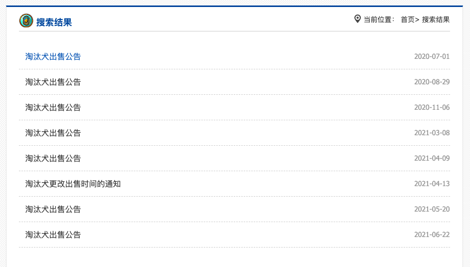 就拿这次发布通告的刑警学院为例,经检索,此前他们还发布过6次《淘汰犬出售公告》。每批拍卖的犬只数量不一,但原因都差不多。