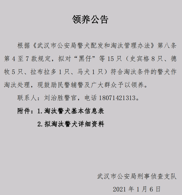 除警察院校外,警队也会拍卖淘汰警犬。2021年1月6日,武汉市公安局刑事侦查支队发布《领养公告》,对15只符合淘汰条件的警犬做淘汰处理,并鼓励民警辅警及广大群众积极领养。这批淘汰犬不仅有四岁正值当打之年的工作犬,也有十三岁功勋卓著的退役犬。