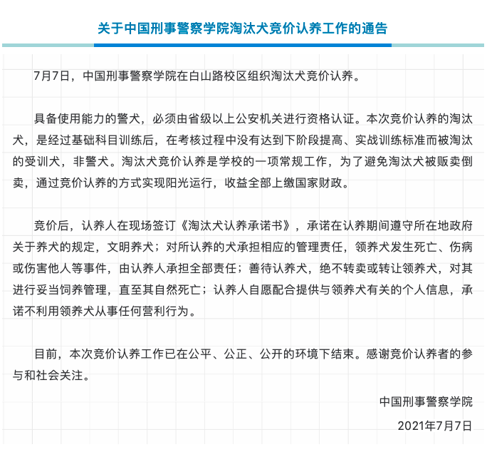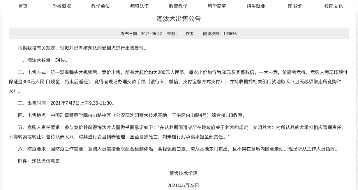 6月22日,中国刑事警察学院(以下简称刑警学院)的一则淘汰警犬出售公告引发网友围观。