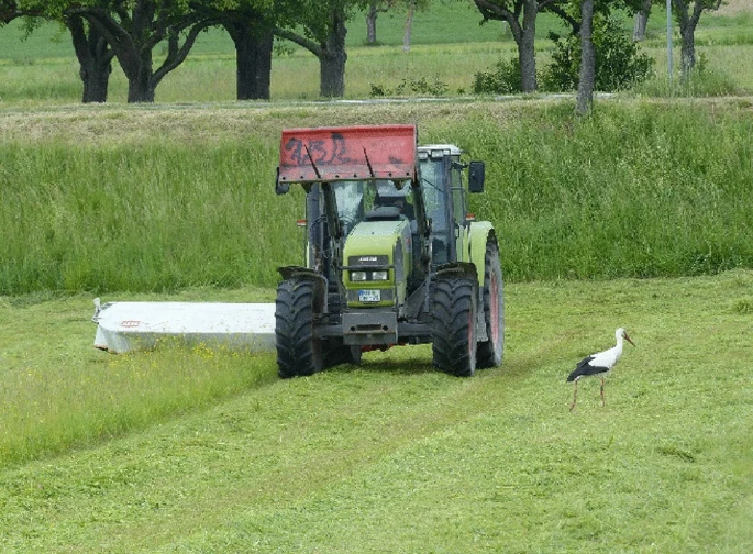 白鹳当然不是无缘无故出现在那里,而是为了找吃的。高高的草被拖拉机割掉的时候,一些小动物,比如蜗牛、青蛙和老鼠就失去了藏身之地,暴露在白鹳的视野范围内,它们很容易成为白鹳的囊中之物。