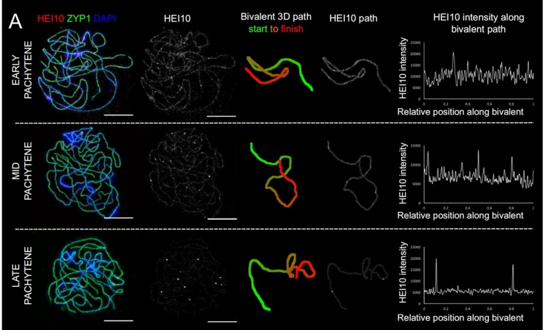 在染色体重组过程中,HEI10蛋白的移动情况,从最开始的数百个小的聚集体,最终只富集在几个位点。(图片来源于论文)
