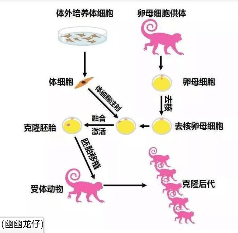 克隆是指生物体通过体细胞进行的无性繁殖,以及由无性繁殖形成的基因型完全相同的后代个体。科研人员先将含有遗传物质的供体细胞的核移植到去除了细胞核的卵细胞中,利用微电流刺激等使两者融合为一体,然后促使新细胞分裂繁殖,发育成胚胎,当胚胎发育到一定程度,再植入动物子宫中使动物怀孕。最后,就是等待克隆胚胎降生了。