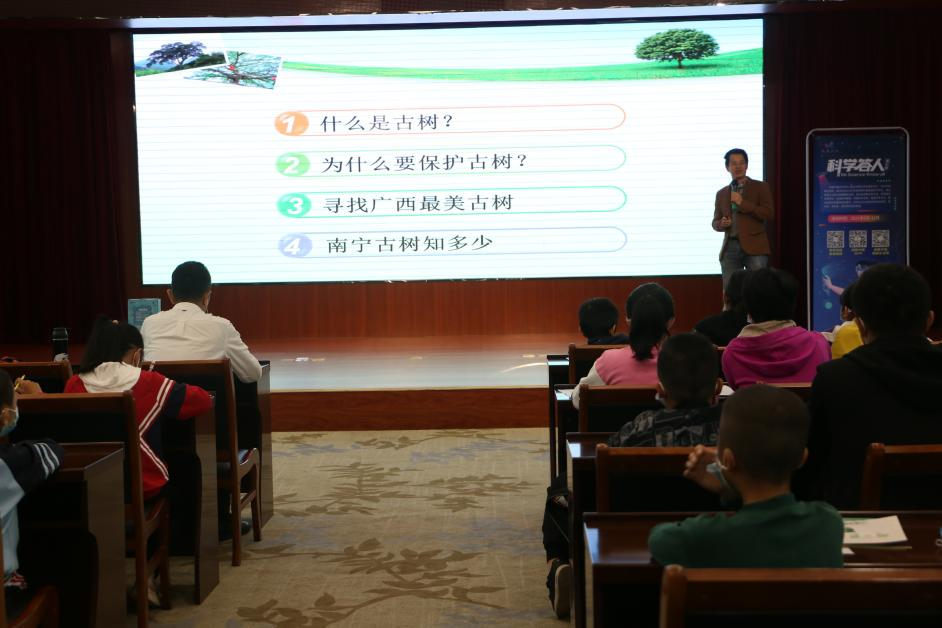 葛郁槟简要总结了林建勇专家的科普讲座,并阐述了良好生态环境对社会、对国家持续健康发展的重要意义,呼吁大家积极关注我们所拥有的自然资源,关注大自然和历史留给我们的宝贵财富,从小事做起,保护我们的历史文化遗产,保护我们的“绿水蓝天”。接着,葛郁槟结合科普讲座内容,与活动参与者们开展了“科学答人”广西古树名木专题互动问答。随着一份份精美礼品的送出,现场氛围越发热烈,大家充分调动起科普讲座中所学到的科普知识,踊跃举手抢答,欢呼声、掌声不断。