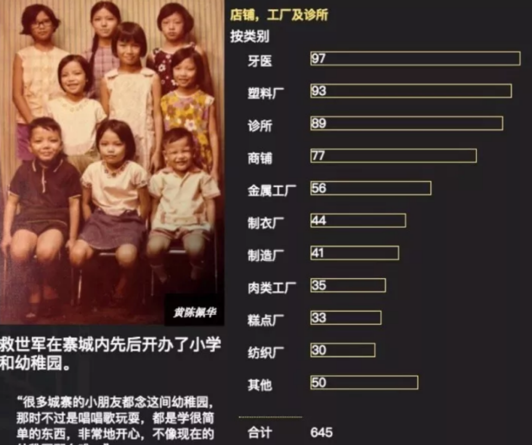 自力更生的寨民们开设了食品加工厂,其中最出名的一家面粉厂在其全盛的日子里,可以日产1000张面饼。而根据九龙城寨街坊福利会于1983年统计的数据表明,当时整个九龙寨共有各种类别的厂房累计几百所。