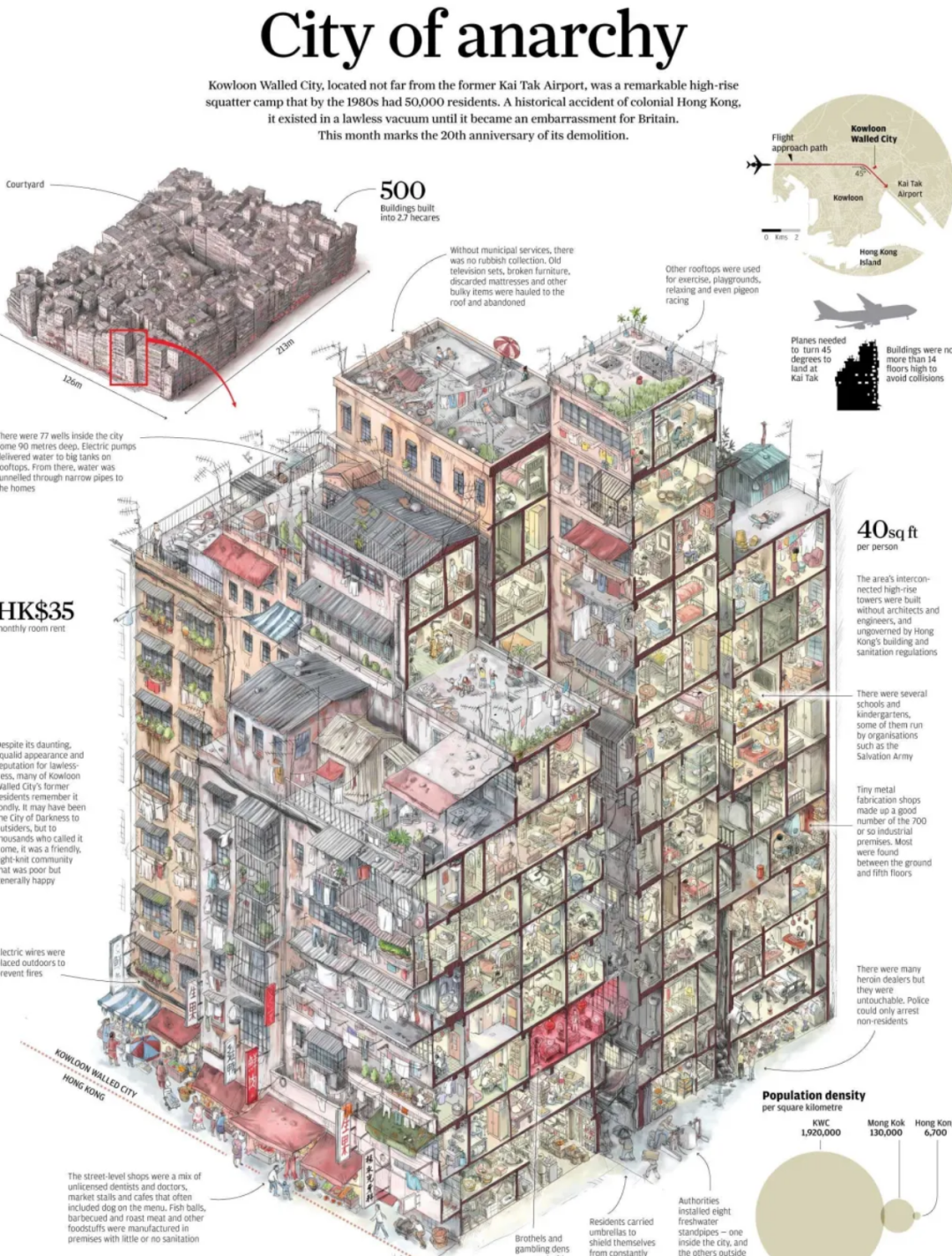 随着投靠九龙寨的偷渡客、流民、黑帮分子越来越多,违章搭建的棚屋开始拔地而起、野蛮生长,直至长成350栋高度在10-14层的高危建筑群。如果不是因为50米外便是启德机场,恐怕这座建筑群还会更加高耸。