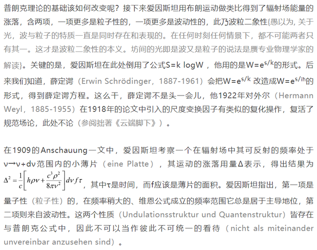 Unvollkommentheit,不完备性,这是爱因斯坦这个量子力学奠基人后来对量子力学一直挑剔的地方。介绍这一段,是想让大家看到爱因斯坦在1905年前的一段时间里对物理学就是有通盘考虑的。关于黑体辐射的考虑,那个时刻没有得到正确的普朗克分布,但是爱因斯坦没有放下这个问题。当爱因斯坦十年后再回到这个问题时,突破性进展就来到了。所谓“念念不忘,必有回响”,信夫!爱因斯坦总能做出重要的工作,几无失误,也是奇迹。