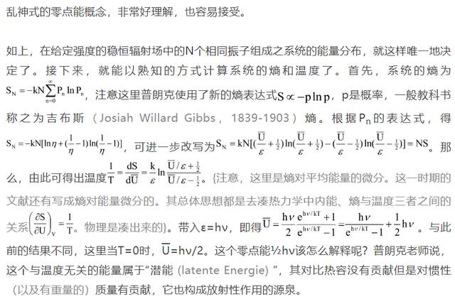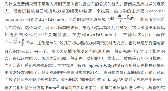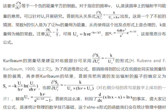 关于那天的推导过程,普朗克自己有非常客观的评价。Im Verfolg dieses Gedankens, bin ich schliesslich dahin gekommen, ganz willkürlich Ausdrücke für die Entropie zu construiren, Unter den so aufgestellten Ausdrücken ist mir nun einer besonders aufgefallen, … Es ist bei Weitem der einfachste unter allen Ausdrücken, welche S als logarithmische Function von U liefern …(顺着这些想法,我最后决定,完全随意地构造熵的表达……,在诸多表达中,这个提供了S是U的指数函数的公式最简单)。看到普朗克这么实在,笔者都笑得差点岔气了。看如今的物理论文,时常能遇到装蒜的货儿,自己根本没有本事写一篇唯一作者的文章,却在事后拿着很多别人凑出的文章编造自己的英明。