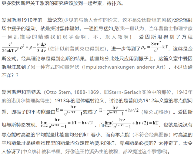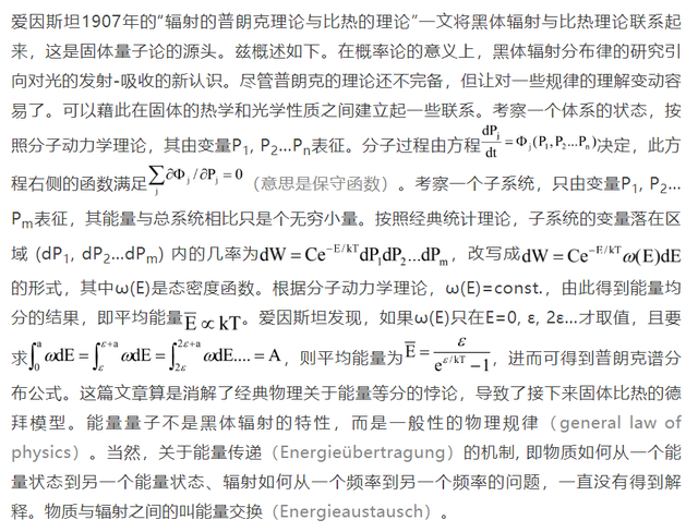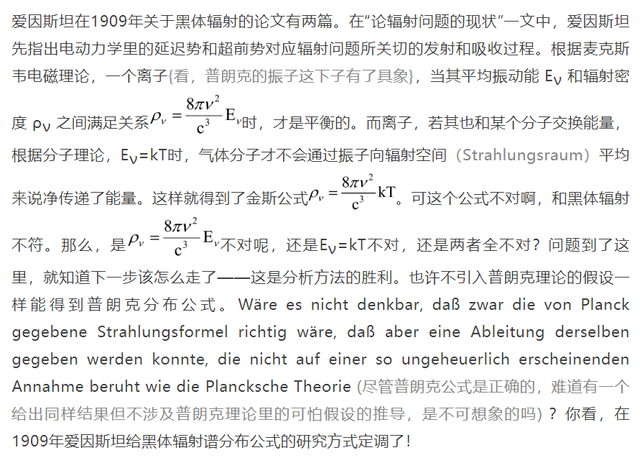 加个小插曲。爱因斯坦1907年申请私俸讲师的论文(Habilitationsschrift),就是关于黑体辐射的,根据派斯的爱因斯坦传记Subtle is the Lord, p185, 该题为题目(英译)为“Consequences for the Constitution of Radiation of the Energy Distribution Law of Blackbody Radiation”,但是我找不到原文。