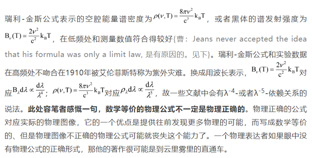 瑞利-金斯公式是不可积的。随着频率的增大谱密度单调地增加,这当然与现实不符。1910年艾伦菲斯特把瑞利-金斯公式在高频部分的失效称为紫外灾难,这都是普朗克给出正确表达式10年以后的事儿了——紫外灾难的说法对黑体辐射研究连一毛钱的价值都没有。这个说法是遗腹子型的,1910年时瑞利-金斯公式早因普朗克的工作而过时了(…was fixed posthumously, because by 1910 the Raleigh–Jeans formula had long been rendered obsolete by Planck’s work)。有趣的是,在此后的许多书本里紫外灾难仍被津津乐道,愚以为除了人们热衷怪力乱神的心理因素以外(同样泛滥的还有薛定谔的猫,海森堡不确定性原理),一个可能的原因是以后理论物理中还源源不断地涌现各种在变量足够大时发散的无脑理论。宇宙没有无穷,宇宙也没有矛盾。我们在物理理论中看到的无穷与自相矛盾都是人构造物理时遭遇的无奈。