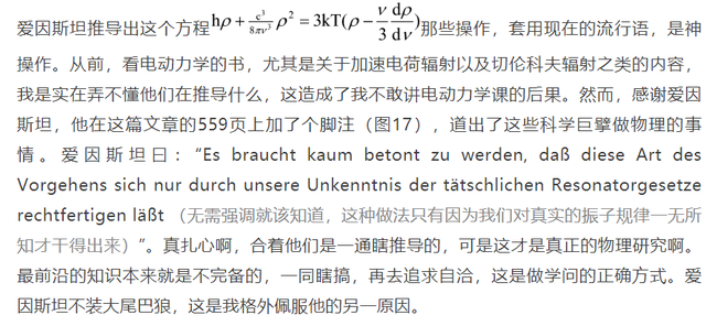 必须指出,普朗克不是用数学函数去拟合(fit)人家的实验曲线, 也不是拿实验曲线去同人家的理论凑合(appeal to),用普朗克自己的话说,他用的是die von mir entwickelte elektromagnetische Theorie der Strahlung(俺自己发展起来的电磁辐射理论)。一个物理学家一生中若有一次可以这样说话,那他就真是一个物理学家了。