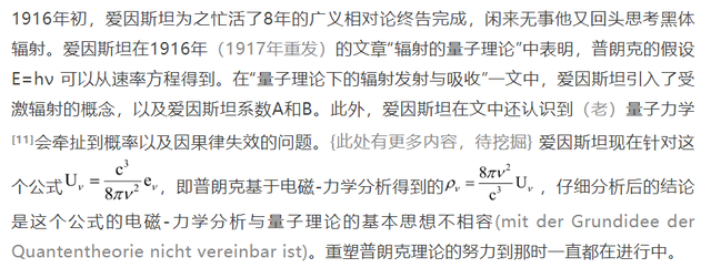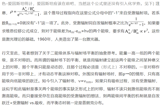 物理学在1916年的情形跟1900年完全不一样了,此时黑体辐射问题被很多人关注过,1913年玻尔也提出了发光过程的跃迁概念。从量子角度考虑辐射-物质间的相互作用成为可能。爱因斯坦把1916年发表的“量子理论下的辐射发射与吸收”扩展成了“辐射的量子理论”。爱因斯坦考察物质粒子和辐射之间的相互作用, 采用的模型为光与分子组成的体系。若知道物质粒子的能量分布规律,则可以由交换能量的静态条件获得黑体辐射的分布规律。笔者提醒各位注意,爱因斯坦谈论这个量子力学问题时用的是经典概率而不是概率幅,这再再告诉我们量子力学骨子里头根本就是经典力学!我们自己以为的量子力学都是在谈论概率幅(波函数)的观念是没理由的。爱因斯坦太伟大了,但凡读懂一篇他的文章,你就能体会到爱因斯坦不同常人的伟大。{2021.10.11晚,笔者认识到读爱因斯坦的论文不可遗漏一字。漏一字都可能错过点儿闪光的思想!}爱因斯坦在这篇文章中给出的推导有没有道理,对不对?不好说!但是,到了1960年,基于爱因斯坦的受激辐射概念人类确实制造出了激光。我时常想,物理真需要是对吗?或者说,能引导出新的事物,不也是物理学理论正确的最好证明。这些年笔者仔细回顾那些伟大的物理理论,发现其实几乎没有对的。但是,但是,这并不重要。重要的是我们人类的认识,以及借助认识获得的能力,进步了。