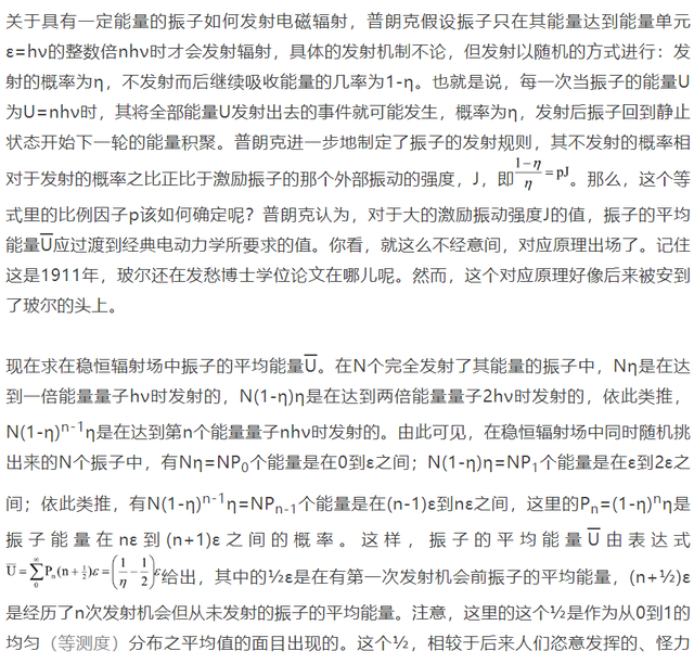 命性概念的人。但是,笔者发现事实很打脸,普朗克从来都是一个保守的人。革命没有那么容易。一个频率上的振子们所分配到的能量为E,与其对应的能量单元ε,关系式为P=E/ε, 即能量包含P个能量单元。但是,普朗克没有理由认为P是个整数,而是他不得不使用整数,要不怎么接着玩排列组合呢?{我发现艾伦菲斯特、德拜、玻色这些大神可没这些顾忌,连微分小量都敢拿过来做排列组合运算,见下文。好的物理学家都是李逵式人物,遇到问题先提着板斧砍杀过去再说}在原文中,普朗克是这样写的: “如果P=E/ε计算得到的商不是整数,P可以取近似的整数(wenn der so berechnete Quotient keine ganze Zahl ist, so nehme man für P eine in der Nhe gelegene ganze Zahl)”。也就是说,普朗克采用的是取整的算法,用今天的数学记号,是P=[E/ε] ,至少在这一步上他没有迈出革命的一步,故而有“普朗克半推半就的量子化处置(halbherzige Auffassung der Energiequantisierung à la Planck)”的说法。所谓的P=[E/ε],就算是P=E/ε,对于普朗克来说那也就是着急忙慌中不得已引入的抓手(Notbehelf,erzwungenermaßen eingeführt),而非什么革命的思想。所谓普朗克是Revolutionär wider Willen(违背意愿的革命家),我猜是说,别人说普朗克是革命者,这违背了普朗克自身的意愿。赵匡胤黄袍加身的感觉哈(附加图1)。