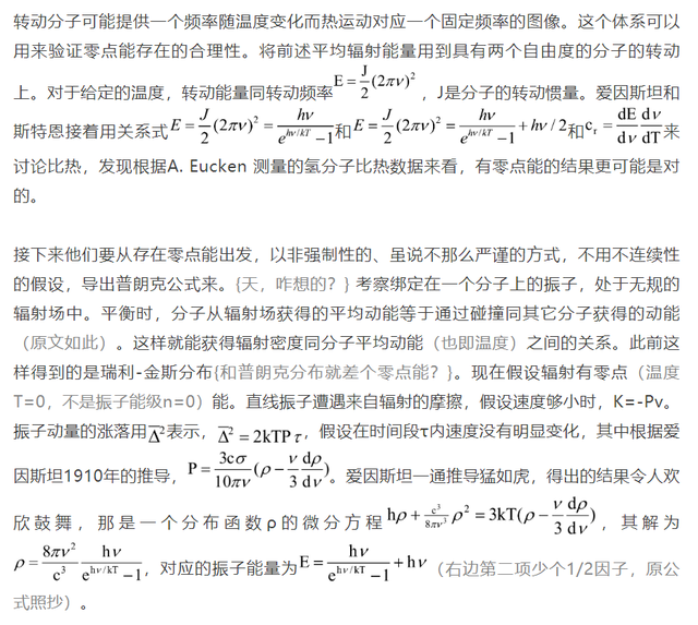 文章最后,爱因斯坦总结了两条:1).氢气比热结果使得量为hν/2的零点能的存在更加有可能(mach die Existenz einer Nullpunktenergie von Betrag hν/2 wahrscheinlich);2). 零点能使得不借助任何不连续假设就能得出普朗克公式。当然,能量不连续性假设自有其道理。看看爱因斯坦的用词,machen wahrscheinlich,没有一点儿吹牛的意思。