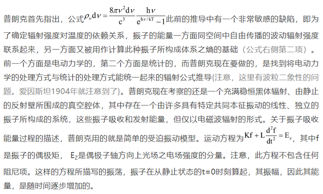 在普朗克的黑体辐射研究报道中,会提及辐射的振子。振子,什么振子?我当年学习相关内容就一直弄不懂这振子哪来的,不是说好的空腔辐射(Hohlraumstrahlung)吗?关于振子,普朗克一开始用的是Resonator,后来改用Oszillator,再以后连炭粉(Kohlenstäubchen)都出来了。为什么会引入振子呢?振子是用来Ermitteln(中介)辐射分布的,让辐射现形的。这就是probe for theory. Die Theorie braucht ermittelt zu sein(理论需要被中介)。关于普朗克引入振子概念及用词的变更,库恩有详细的讨论(见Thomas Kuhn,1978)。后面我们还会回到这个话题。