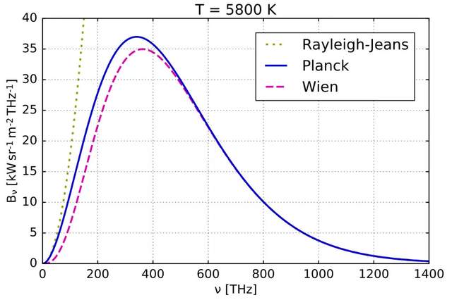图14. 维恩分布、瑞利-金斯分布和普朗克分布的对照。瑞利-金斯分布只在频率接近0的很小范围内同现实相符。