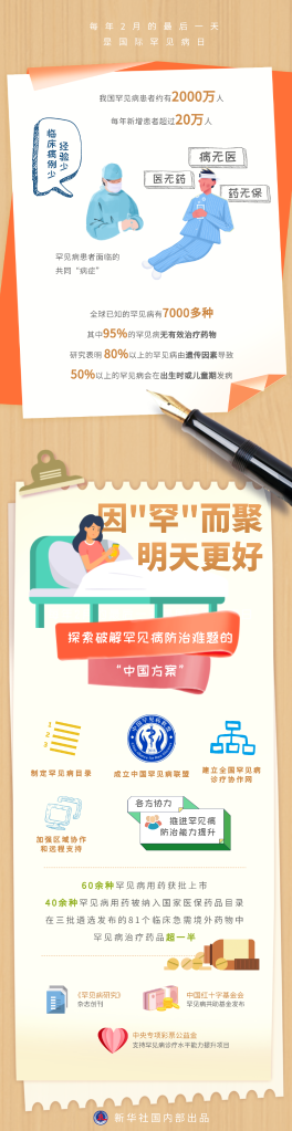 据调查,以往罕见病患者平均确诊时间为4年,临床上病例少、经验少、可用药品少且贵,导致很多罕见病患者“被耽搁”。每年2月的最后一天是“国际罕见病日”。在我国,包括纤纤在内的2000多万罕见病患者越来越多地“站到了聚光灯下”。