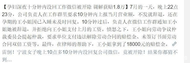 2018年7月,已经怀孕的王小姐,因为晚上10:23在工作群里收到上司的工作消息10分钟内没回复,被单方面直接开除了。