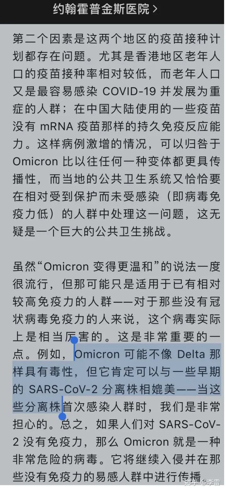 不过最近约翰斯霍普金斯医院发了一个内容,指出奥密克戎的毒性相比于原始毒株(也就是武汉时期的那个毒株)并没有减弱。
