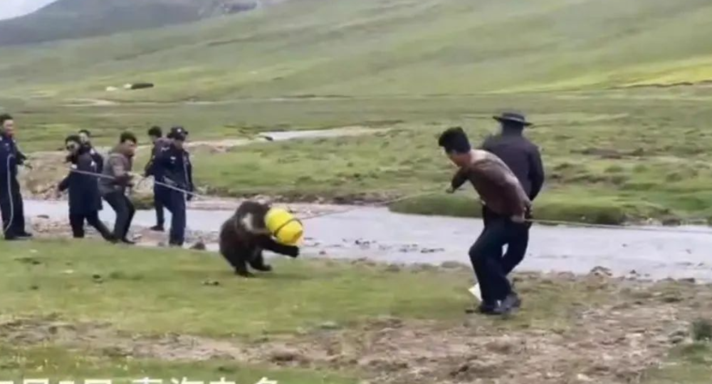 青海300斤的棕熊偷食,头卡进了塑料桶,他们拔河式救助,为其点赞